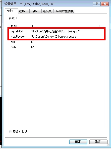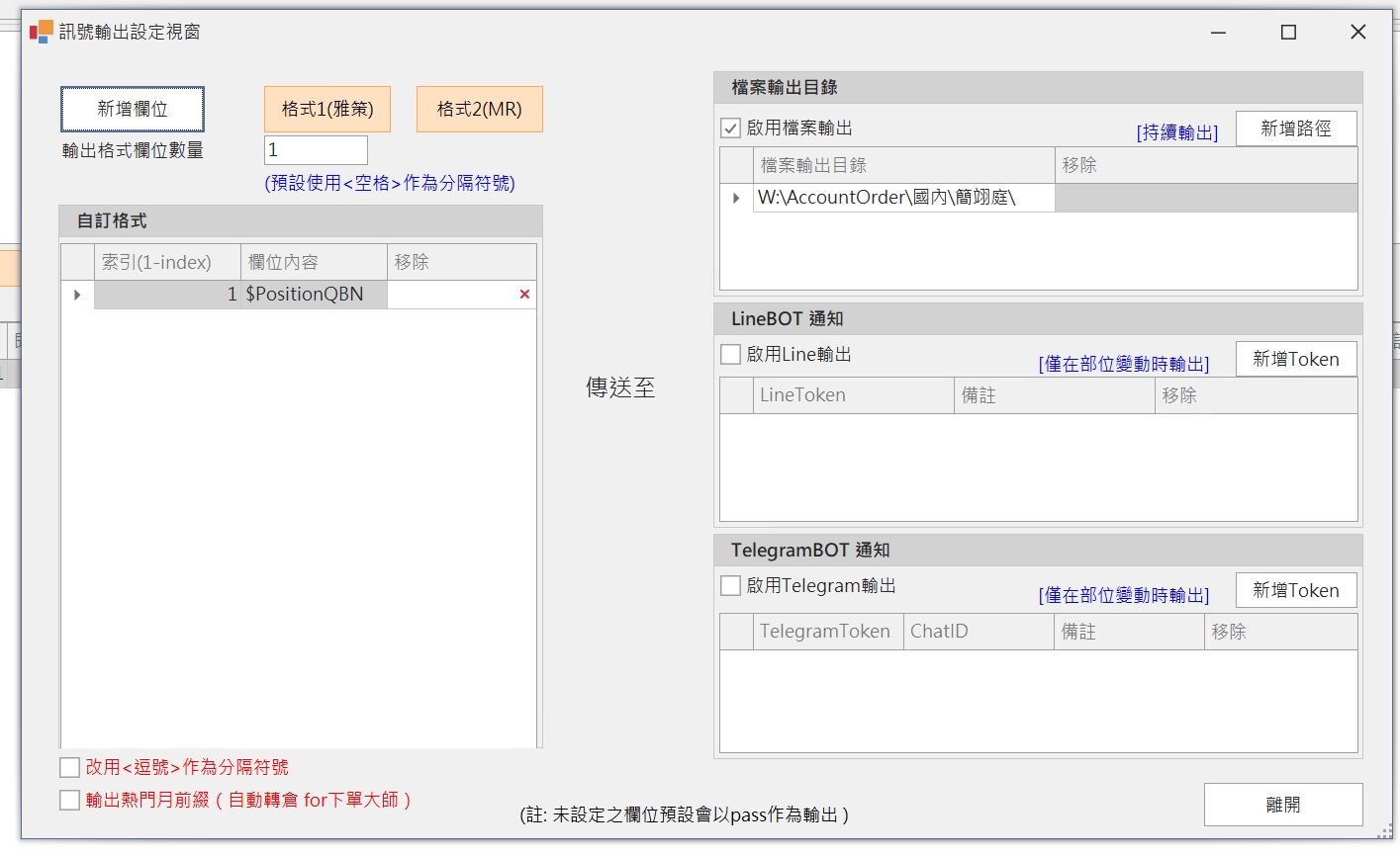 3\. 參數有兩個,\ 第一個參數為商品訊號檔請設定 QuantBrains 所輸出的訊號檔 **(QB平台內輸出格式請設定 $PositionQBN )**