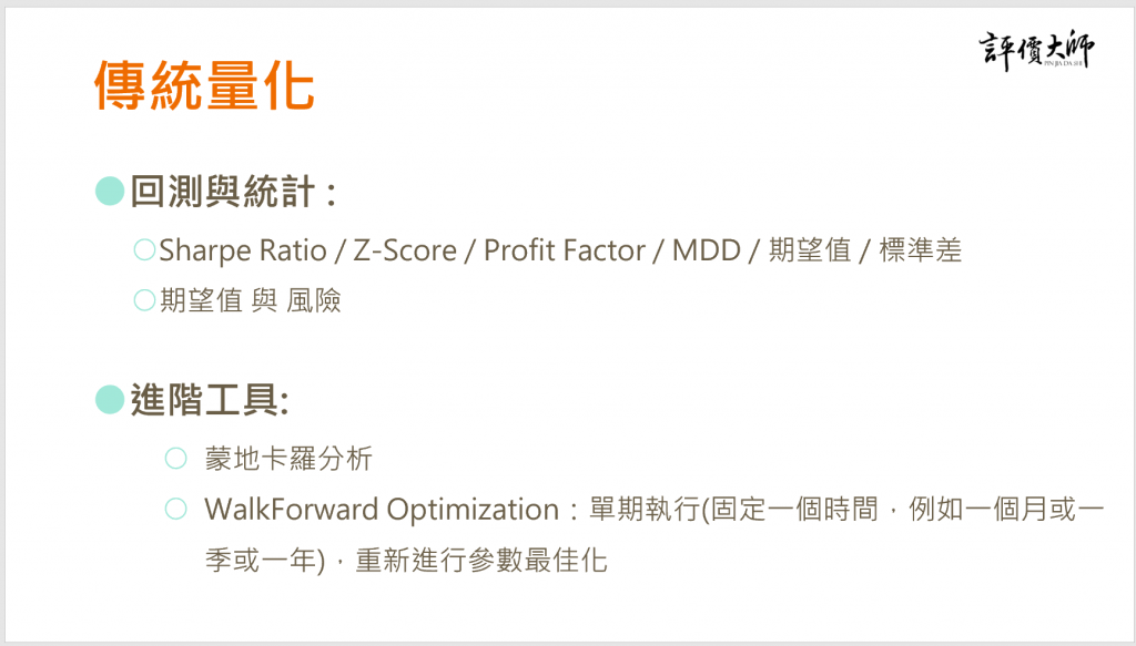這個時候我們會開始接觸到一些統計學概念的東西,像是 Sharpe Ratio / Z-Score / Profit Factor / MDD / 期望值 / 標準差 等等, 大致上這些評價指標主要的目的都是為了描述兩個概念,一個是期望值,另一個則是風險。