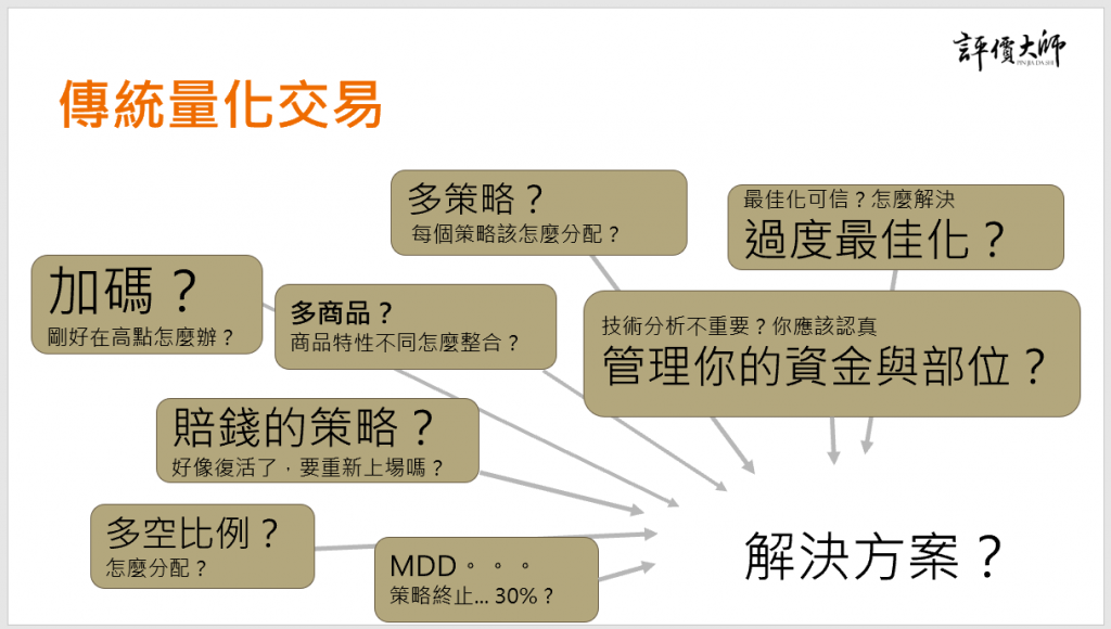 在經過前面這樣策略的研發跟心碎的過程之後,如果我們還沒有死心,還想再繼續撐下去,我們可能還會遇到各種問題,如同上圖我們所看到的,單一策略本身除了基本的進出場條件, 像是加碼的問題,停損的問題,策略上下架,過度最佳化的問題等等。而多策略(也就是投資組合)也會遇到一些像是相互搭配(互補)的問題,比例配置的問題?