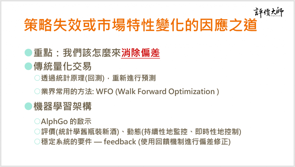而多數的傳統量化策略交易會失敗最大的原因其實就是因為偏差的產生。當偏差隨著時間越來越大,而我們卻沒有相對應的處理機制,放任偏差的放大,就是造成策略交易會失敗最大的原因。