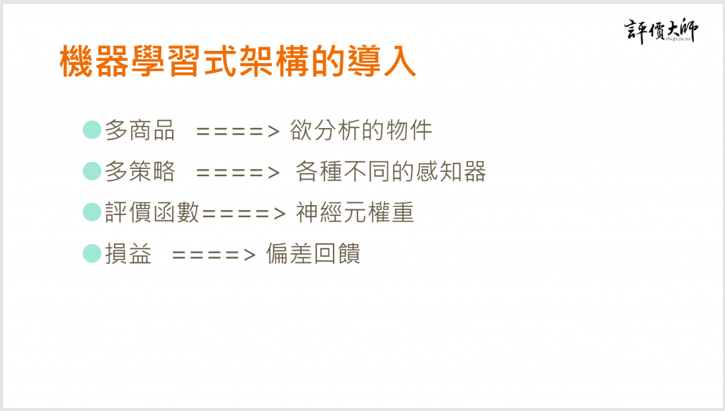前面我們提到的是機器學習的基本概念跟架構(步驟),那我們可以怎麼樣把我們的傳統量化交易來跟機器學習做結合