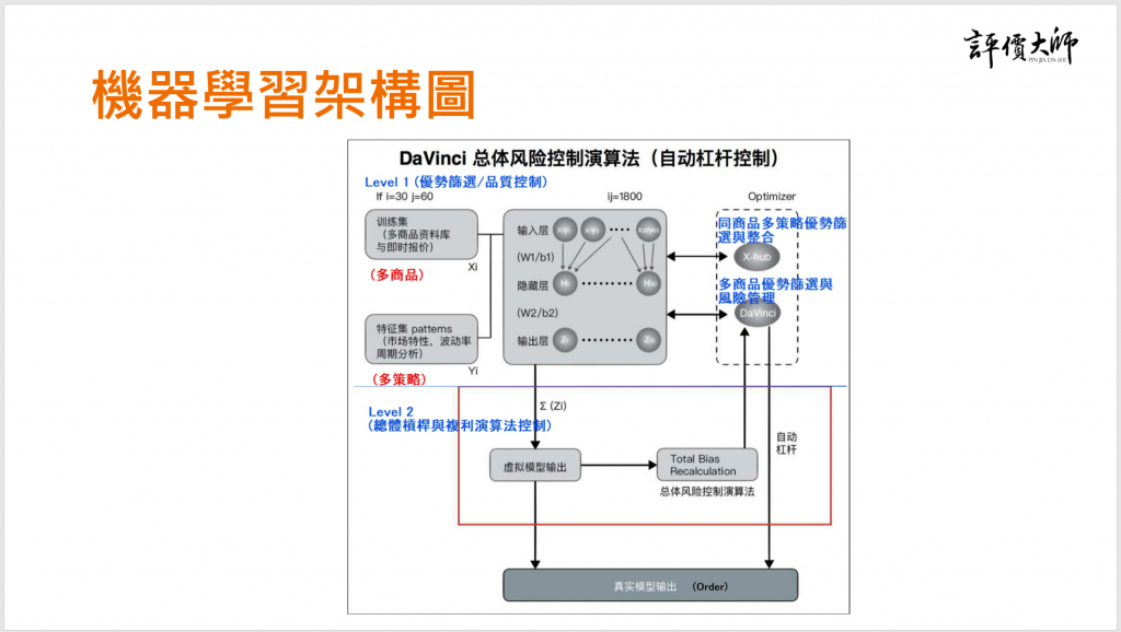 前面第一個層級 Level – 1 主要在做的就是我們這兩頁所講的,對多策略或多商品進行特徵評價的動作。透過評價的結果,我們可以來對我們的策略進行品質篩選,把品質好的篩選出來,並且可以進一步利用評價結果進行策略部位的加權配置,每個tick或是每次交易後皆動態重新計算最新的權重與偏差修正(weight/bias)。(Dynamic Tracking)