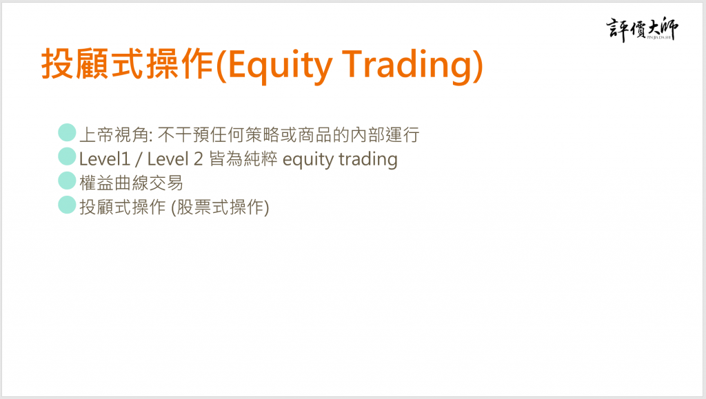 投顧式操作,其實就是大家常聽到的 Equity Trading,不管是 Level-1 以策略或是商品為單位,還是 Level-2 以總體為單位,都是 Equity Trading,也就是我們不會直接去干擾策略內部的操作,所有策略內部的操作我們都把它當作是黑盒子,是虛擬的。用比較容易理解的概念來講,就像是我們在操作股票一樣,不論是 Level1或Level2,我們可以像操作股票一樣,我們不會去干預也沒有辦法去干預股票的走勢,但我們隨時可以進行持股跟出清的動作。