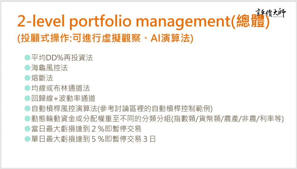 這邊列出來的是一些常見的 Level 2 針對整個投資組合總體操作演算法可以規畫的一些例子