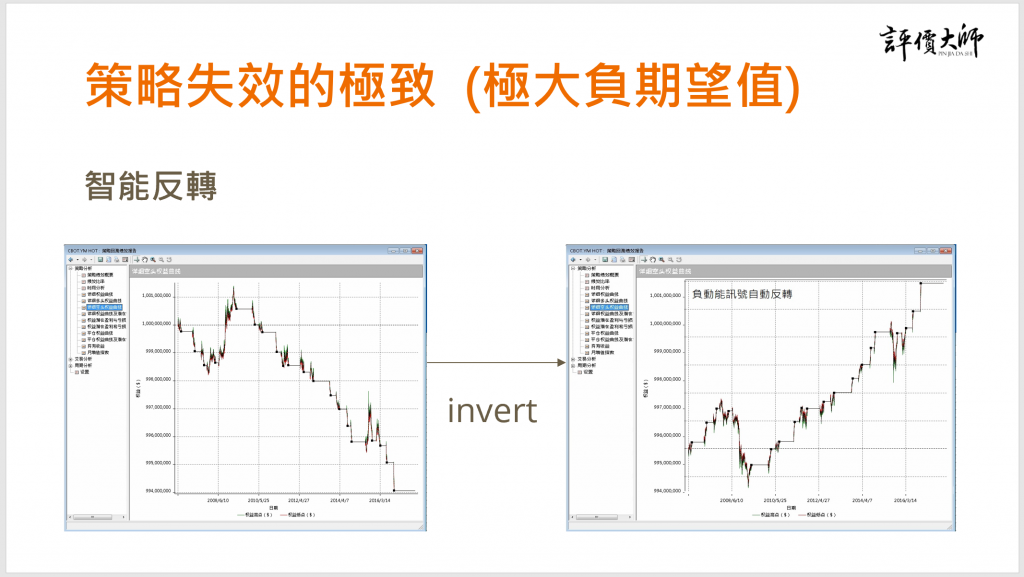 透過機器學習權值的觀念,如果權值評價出來是負的,我們就可以直接跟我們的策略對做,把部位反過來做,多單變空單、空單變多單、停損變停利,然後你會發現順勢波段策略就變成逆勢區間操作策略了。