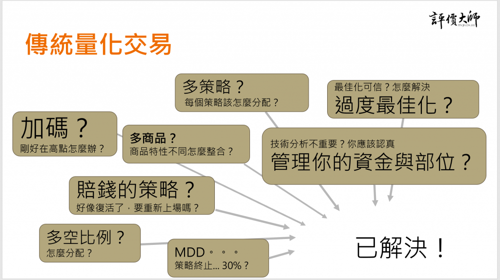 而另一個我們常聽到的主題<策略管理>或<部位管理>其實只是機器學習架構的一個”副作用”,透過這樣的架構我們可以將管理再往上提升為”發現”與”創新”,因為有評價的機制進行篩選,我們可以大幅提升策略庫的可再利用性,甚至免掉研發的步驟,直接將我們想要操作的商品配上原有的策略庫直接掛入機器學習架構中就可以了,不合格的操作方式(策略)會自動被系統捨棄,而合適的操作屬性(策略)會自動被系統篩選出來,這就是AI 的概念。