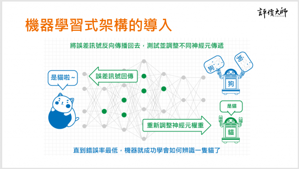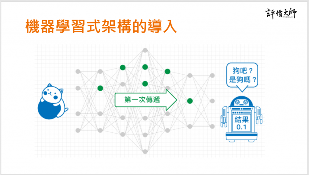 舉例來說,當機器學習(電腦)第一次「看」到一隻貓咪的圖片資料時,會把貓咪圖片的感測結果透過神經網路從左向右傳遞過去,中間會經過特定幾個神經元、經過各個神經元上的機制進行彙整跟評價,然後產出最終的評價結果── 比如最後評價出來的結果是0.1,尚未達到某個閥值,機器學習(電腦)就會認為這張圖片裡面很可能沒有貓咪。