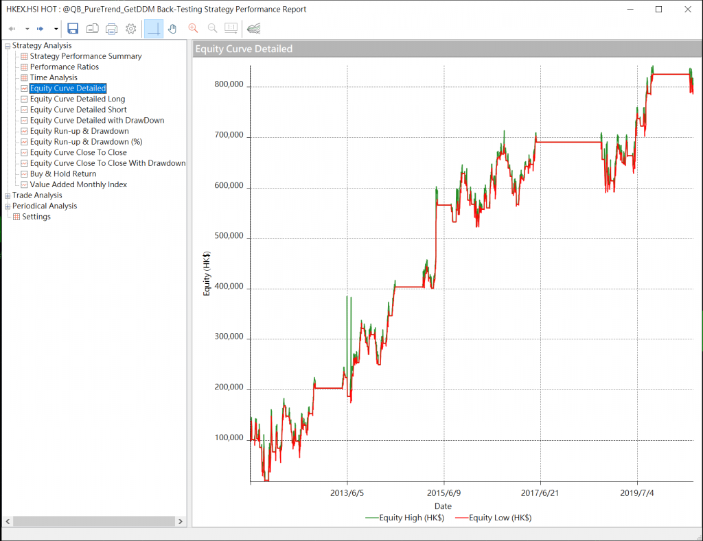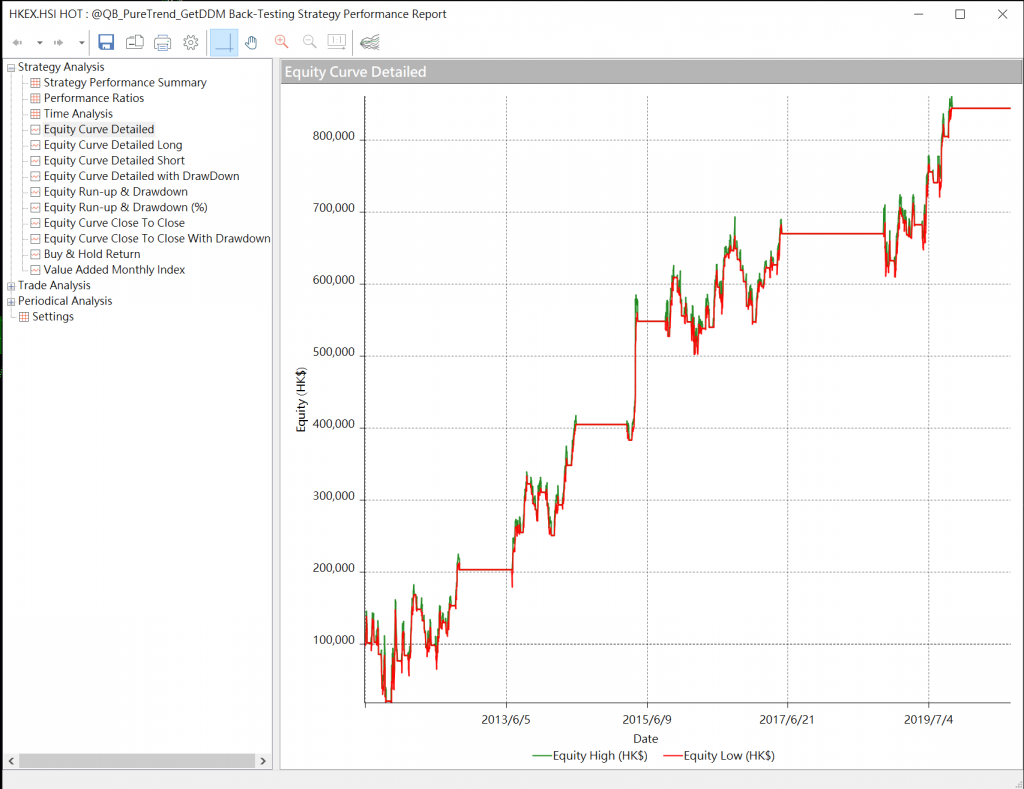 看起來有點黏,恆生的特性,雖然趨勢大的時候很大,但雜訊也不小。如果我們一時間不知道拿什麼當作濾鏡來過濾雜訊(多數人大概都是卡在這一點而踏不進國外商品,因為多數人口袋裡永遠只有一個這幾年最紅的價差濾鏡),那就直接用Drawdown 分布資訊來進行管理就好