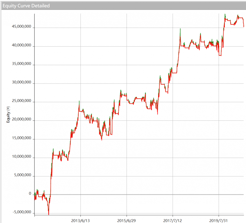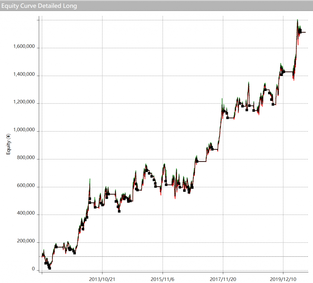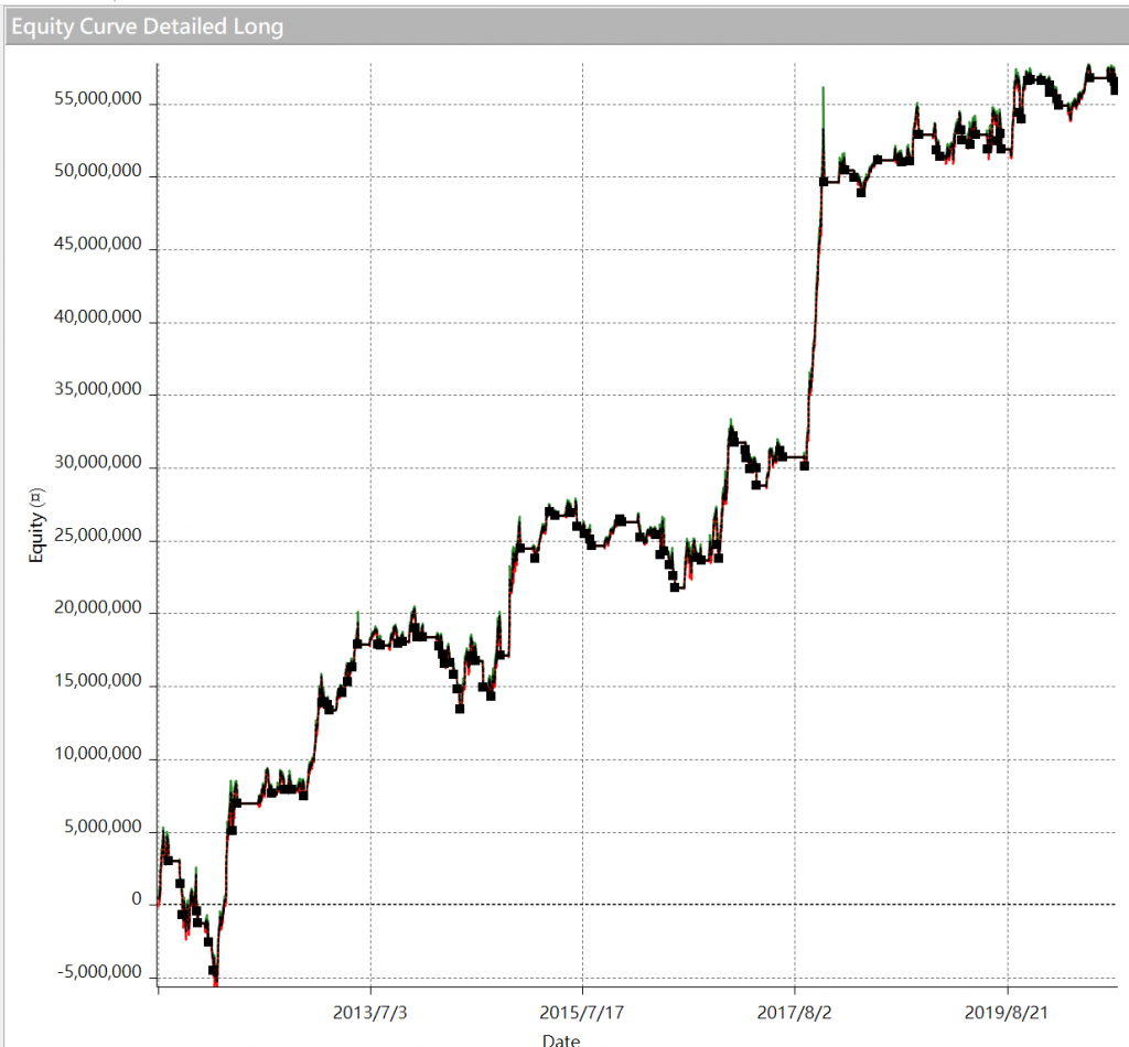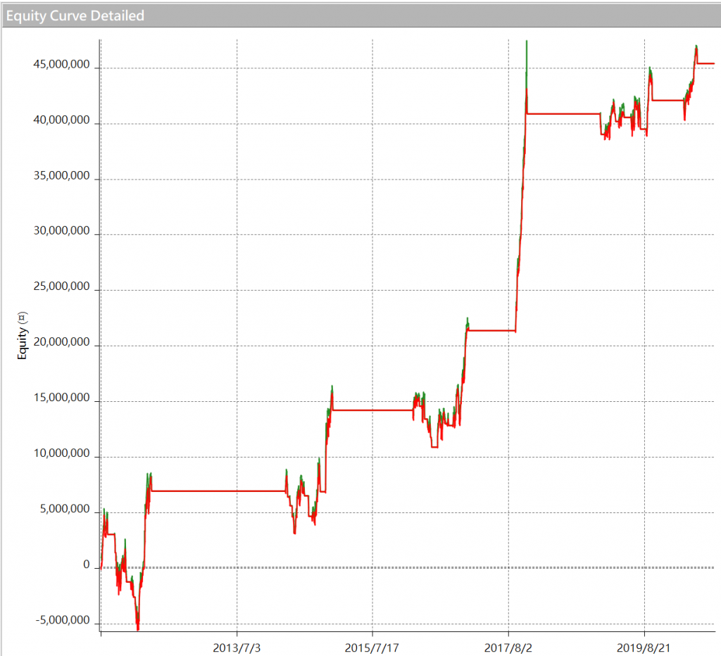 當然這裡也還可以有很多種其他的變形,像上面的DD管理模式我們選擇的是綜合模式(原始策略+DD後加注),如果我們看不慣原始策略的噪音,當然也是可以直接切到mode 3濾鏡模式(下圖),只做DD(虛擬)已發生後的訊號(事實上很多老手到最後都是這樣的模式),一年作沒幾次單(其實市場多數的時間就是在盤整,一直在裡面衝進衝出雖然不無聊,但其實沒什麼效益徒耗交易成本,等待反而是最好的策略),但風報比卻非常高,再透過相同的模式(同一招重覆用到不同商品,這就是穿透)與多商品的堆疊(透過多商品減少資金的閒置時間)將資金在多商品間做最有效率的移轉與應用