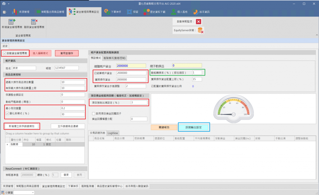 在帳戶金額的部分我們可以填上我們的實際資金大小,綠色欄位則是我們希望由行車電腦丟出來的策略品質與資金分配數值實際上對應的資金大小(槓桿),如設定為1,代表我們希望當分配數值為1時,就對應1%的資金