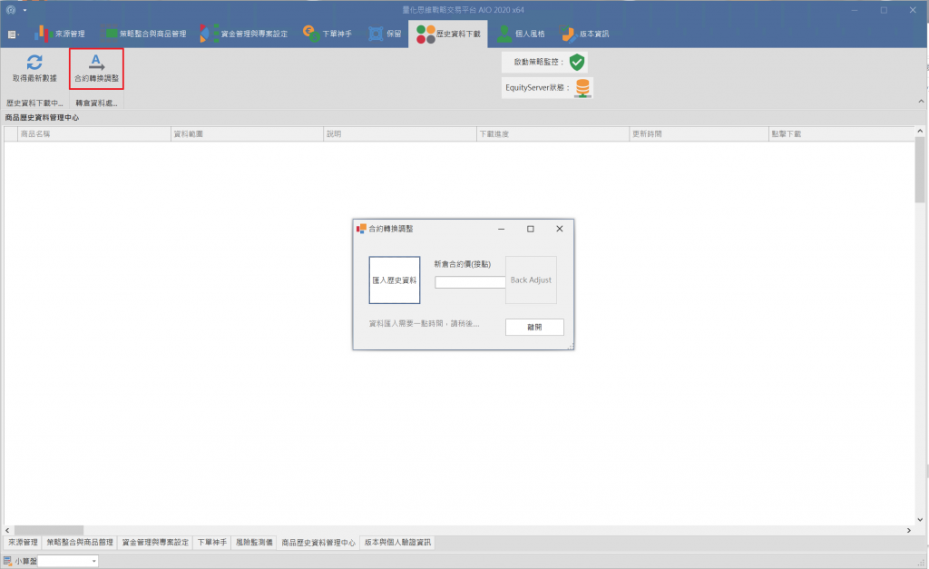 未來每次新合約的轉倉,只需要在轉倉日自行從QuoteManager中將歷史資料匯出,並透過歷史資料下載中心內的 ”合約轉換調整” 功能給予新的轉倉合約價格,即可自行即時處理取得新的 BackAdjusted data以匯回QuoteManager中,不需要再重新下載。