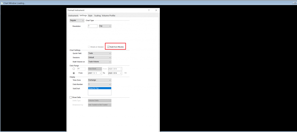 週期選擇”day”(日),記得勾選build from minutes由分鐘線組成),時間從2007年開始
