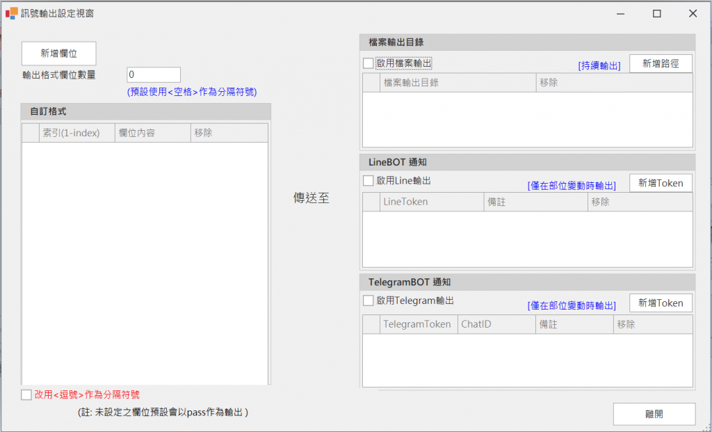 上面欄位設定好之後,即可點選藍色框框按鈕"訊號輸出設定",在這裡我們可以選擇輸出到檔案、Line或是Telegram