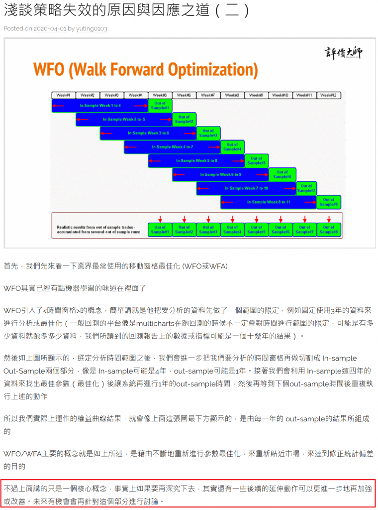 我簡單地補一下,基本上WFO這個概念跟動態資金管理(評價函數)實際上運作的概念是相似的,都是為了盡量減少統計偏差而出現的一種管理架構,差別只在於一個是單期、一個是動態。但他們實際上在實際運作時都會遇到一個問題,就是這樣的架構本身不帶噪音或商品特徵處理(很正常,因為噪音或商品的個別特徵本來就不應該是管理架構要處理的問題),所以很容易帶來一些誤解,像是你會發現使用了WFO變更參數的結果可能反而會造成短期內運作的結果還不如原本沒更改的參數(像前陣子X5兄做的那個回測測試結果),放到動態資金管理(評價函數)這邊來也是一樣,可能有的同學會發現為什麼有時候常常評價跟著行情上去了,排序或權重上去了卻反而要開始盤整了。