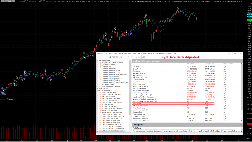 直接拿實際數據出來看,簡單拿靜態回測範例來進行測試,上下圖都進行了相同的部位管理,只有資料不同,上圖有確實作好Data Back-Adjusted,下圖沒有做Data Back-Adjusted只加上結算日收盤出場,新月開盤進場確保回測正確。只是去除了換月價差所造成雜訊,Drawdown的改善幅度竟然可以差到這麼多(代表大行情的時候你可能無感,頂多少賺,但一進入盤整區,這樣一個小動作可能可以救你一命),只花你每次轉倉幾分鐘的動作,什麼腦筋都不用花,你還不做嗎?