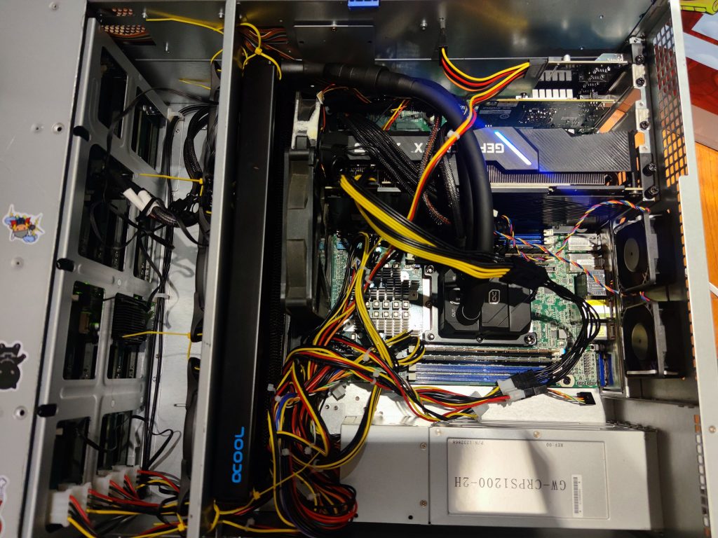 本來想等月中AM5出來再來決定新機器的架構,但淘寶逛一逛還是忍不住一下子就把東西都全買回來折騰了(不過主要理由還是如之前文裡說的,消費機的PCIE通道過少,其實就算等到AM5或intel13代,我應該也是會因為擴充性不足而滅火)。所以….就醬…..新機一樣是走伺服器路線,但選擇可以超頻的W-3175X來解決伺服器時脈不夠爽的問題,但28核心要拉高時脈那瓦數發熱可能相當于兩顆i9,所以不得不在伺服器裡使用水冷(第一次用水冷感覺很刺激,希望別遇上漏尿或幫浦故障這種事),還好伺服器機箱都挺大,雖然原始設計沒有規劃水冷的位置,但發揮一下創意還是塞得下。