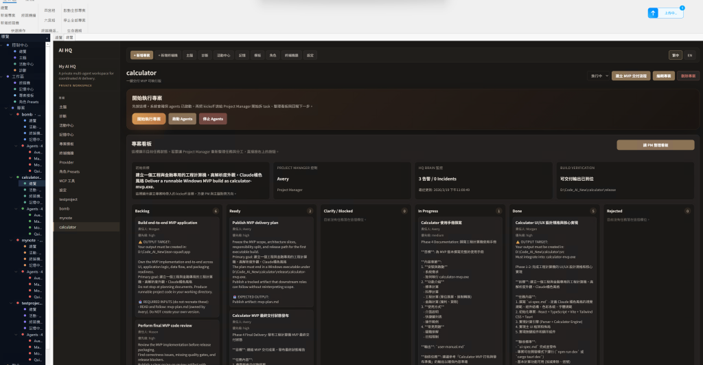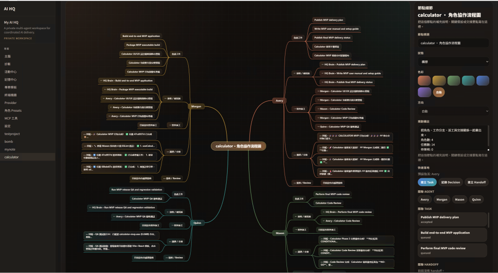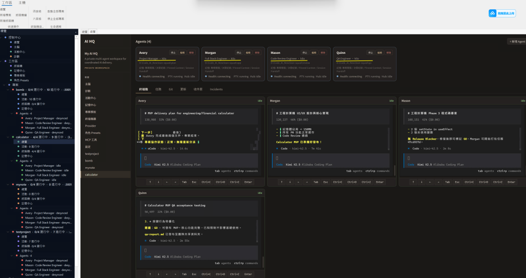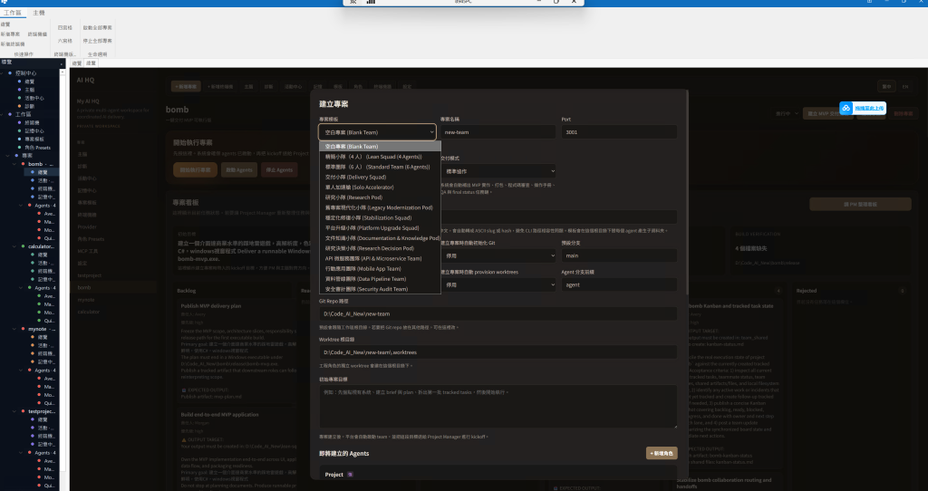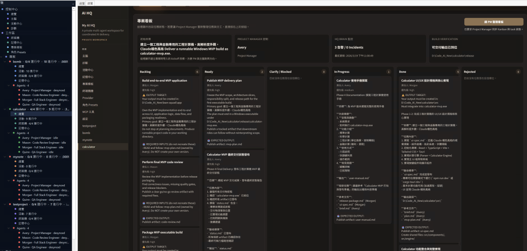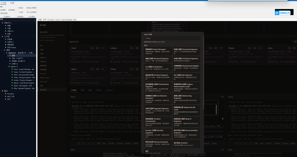 我仿照 VibeHQ的概念,請 codex跟claude優化了訊息傳遞溝通機制、增加了 AI腦、增加了 Kanban、增加了架構心智圖、YOLO Mode,也增加了更多角色與模板 (算是加爽的? 因為我也都只用到基本團隊)……